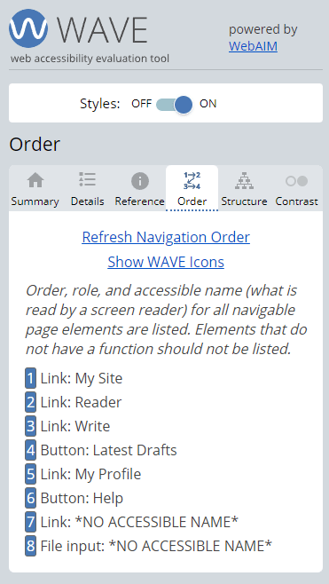 The WAVE browser extension is available on Chrome, Firefox, and Edge, and I have to say, it’s become a favorite of mine quickly. NVDA is cool and everything, but having all the parseable keyboard navigation landmarks in a list is so nice: